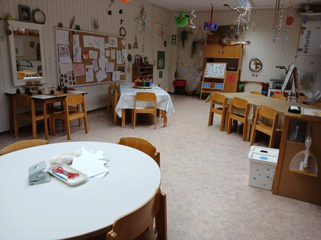 Im Nebenzimmer befindet sich der große Kreativbereich, dort können die Kinder Malen, Basteln, Kleben, Schneiden uvm. Hier findet auch der Vorschultreff der „Großen“ statt. Zudem befindet sich hier die Leseecke, in der sich die Kinder Bücher anschauen oder sich ausruhen und entspannen können.