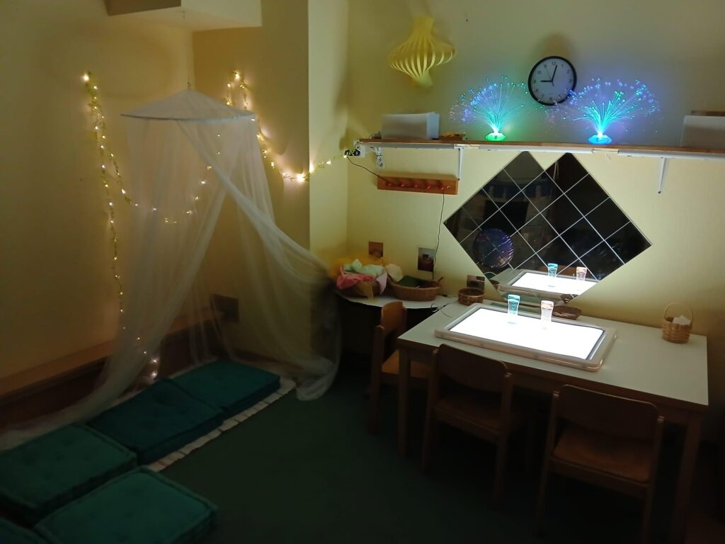 Unser Sinnesraum soll den Kindern einen Rückzugsort bieten. Hier gibt es verschiedene Lichtquellen & ruhige Musik. Es stehen den Kindern Sitzkissen, Decken und Kissen zur Verfügung. Im Sinnesraum können Bücher angeschaut werden, sowie Massagebälle und eine große Klangschale genutzt werden. Desweiteren gibt es dort eine Lichtplatte mit Legematerial.