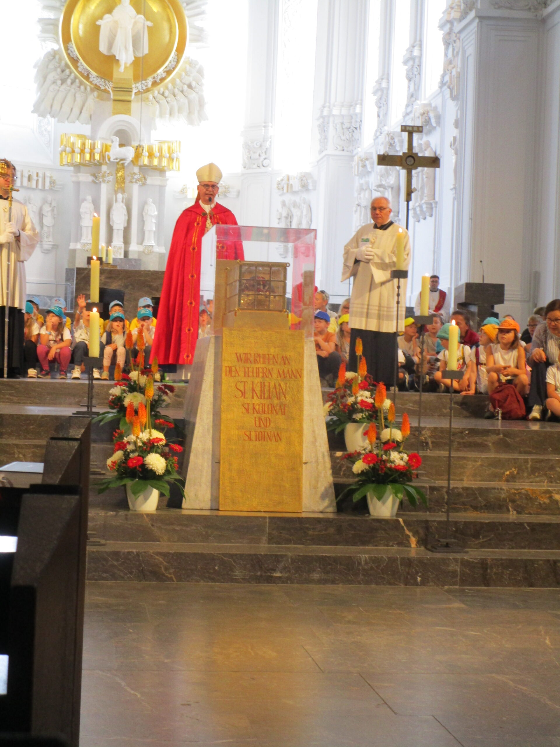 Unsere Vorschulkinder durften mit dem Bus der Firma Federlein nach Würzburg zur Kiliani-Kinder-Wallfahrt fahren. In Würzburg angekommen konnten wir direkt am Main an einem schattigen Plätzchen frühstücken. Frisch gestärkt ging es zur St. Burkard Kirche, dort hielt der Bischof Franz Jung einen wunderschönen Kindergottesdienst ab. Viele andere Kindergruppen waren angereist und die Kirche war sehr voll. Danach ging es in einem großen Zug, mit Pilgerstab und ganz vorn der Bischof, zum Würzburger Dom.